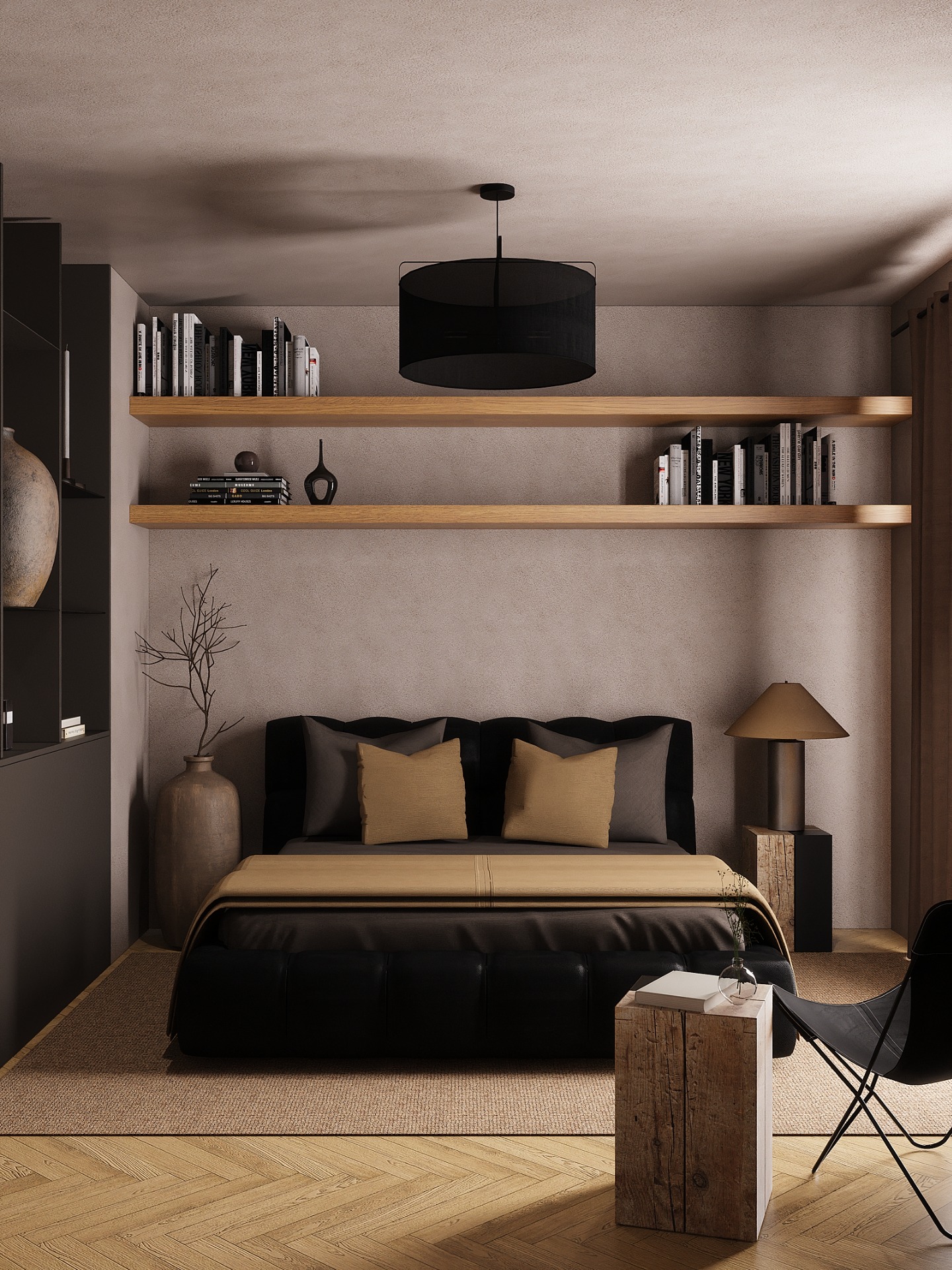 Spálňa so šatníkom, v tlmených tmavších farbách. (Bratislava)